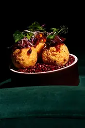 Sweet potato croquettes with crispy gari, Scotch bonnet chutney, smoky tatashe, and onions.